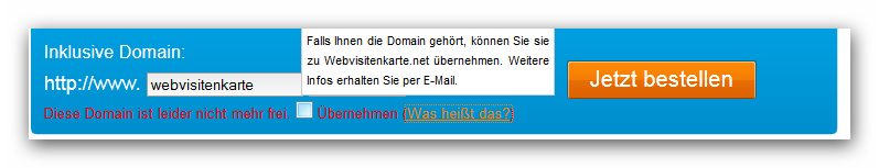 Wenn Sie bereits eine Domain besitzen, können Sie mit dieser natürlich zu Webvisitenkarte.net umziehen. Hierfür geben Sie einfach beim Tarif Upgrade Ihre Domain ein. Ihnen wird angezeigt: Diese Domain ist leider nicht mehr frei. Setzen Sie einfach einen Haken bei Übernehmen. Für diesen Vorgang müssen Sie aber der Eigentümer der Domain sein.